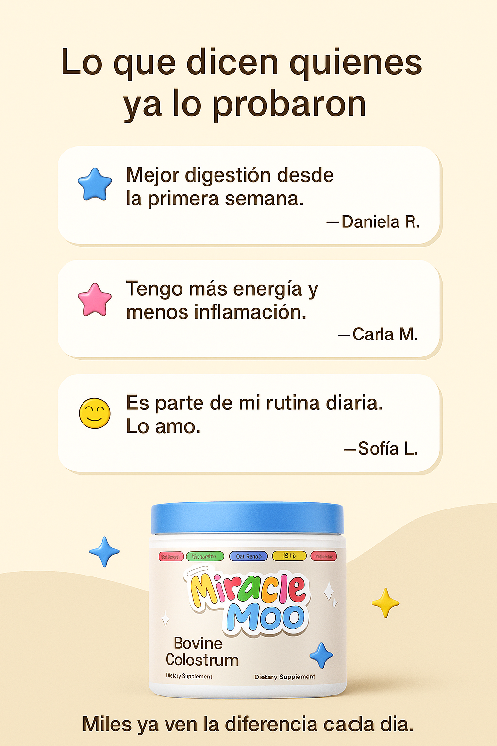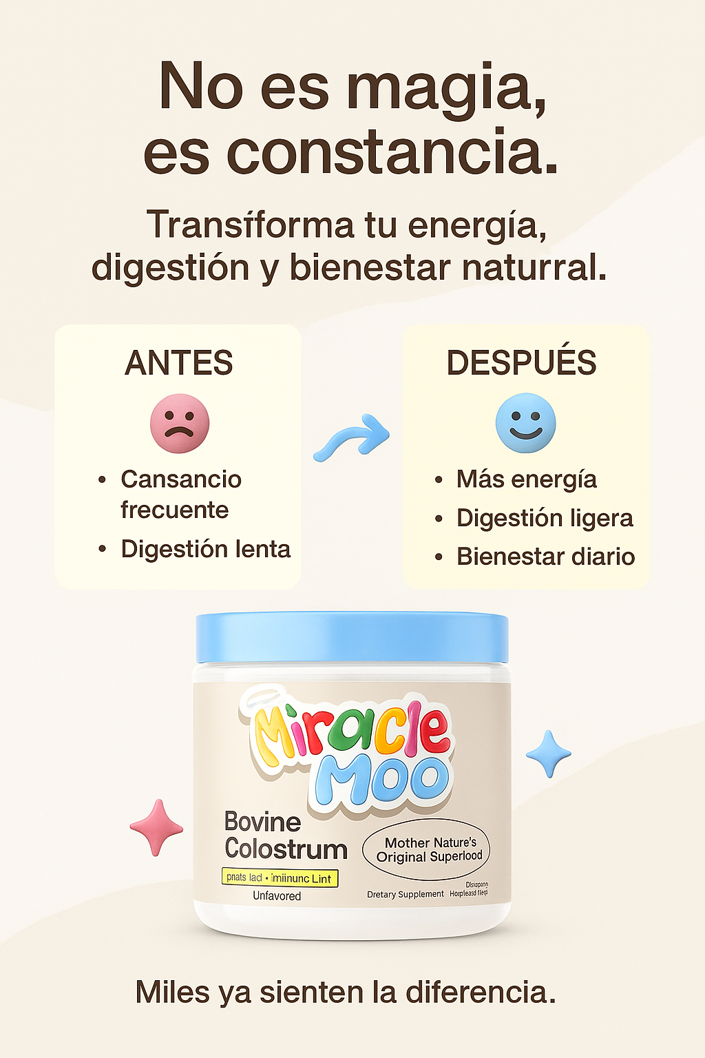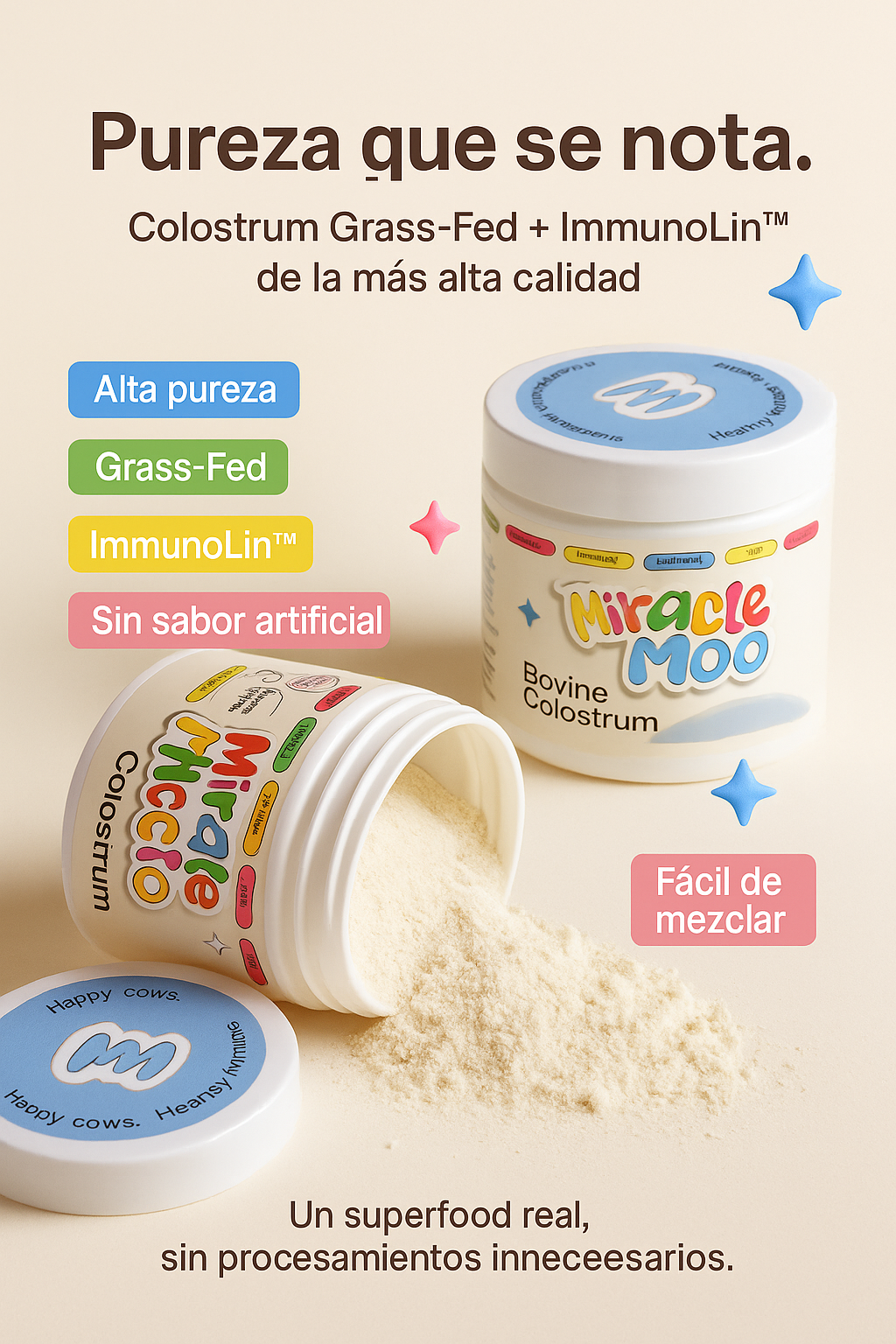 El superalimento natural que mejora tu energía, digestión, piel e inmunidad desde adentro. MiracleMoo trabaja a nivel celular gracias al calostro bovino grass-fed, rico en anticuerpos naturales.